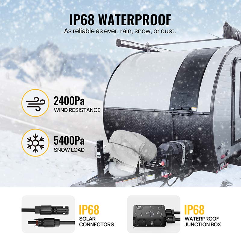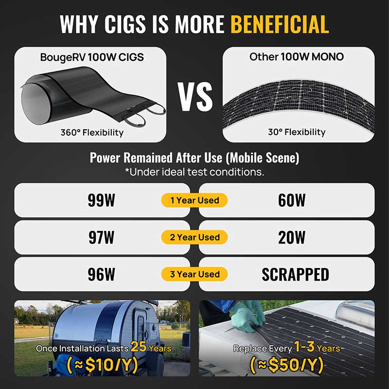 Join the solar revolution with BougeRV's innovative Yuma 400 Watt CIGS Flexible Solar Panel with Adhesive! Our cutting-edge CIGS solar panels are uniquely designed to flex and adjust to any surface while utilizing Copper Indium Gallium Selenide (CIGS) technology to enhance their durability, light sensitivity, and lifespan. Looking for high-quality CIGS solar panels for sale? Look no further than BougeRV! Our panels can be easily installed or used as a portable energy solution. Invest in the best and switch to BougeRV's CIGS solar panels today!